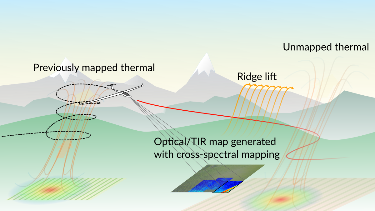 A major factor restricting the utility of UAVs is the amount of energy aboard, which limits the duration of their flights. Birds face largely the same problem, but they are adept at using their vision to aid in spotting — and exploiting — opportunities for extracting extra energy from the air around them. Within the project we developed infrared (IR) sensing techniques for detecting and mapping naturally occurring atmospheric phenomena called thermals based on a heatmap on the ground for extending the flight endurance of fixed-wing UAVs. Furthermore, we trained a neural network to detect small distortions on a single grayscale image caused by temperature gradients in the air. Detecting these so called "schlieren" could be used in the future to directly observing the thermal updraft column using an simple camera onboard an UAV.
